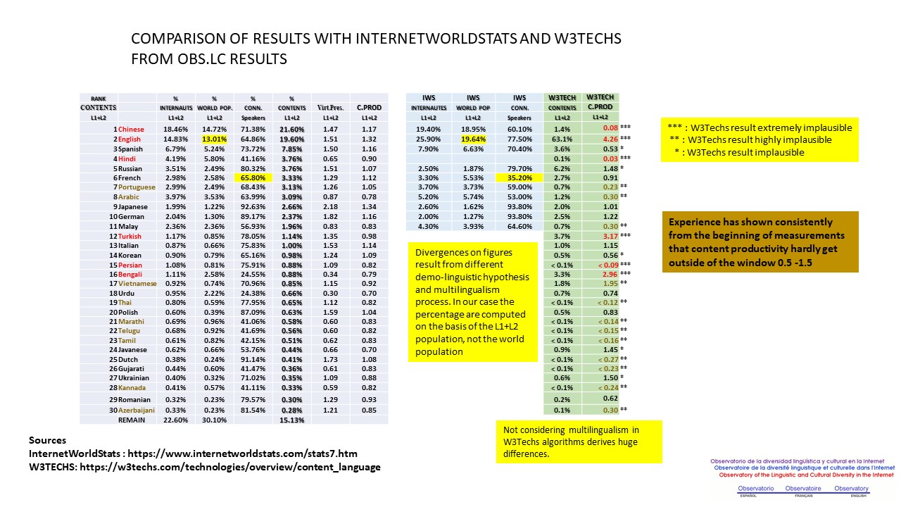 Some important differences for demo-linguistic data, especially for Russian, French, German, Malay, Arabic and English.
