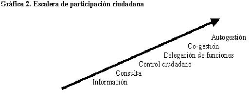 En teoría, la participación ciudadana puede dibujarse usando la imagen de una escalera, que va de menores a mayores grados de involucramiento de la ciudadanía, respecto a, desde el acceso a información, hasta la gestión de las políticas:14 La gráfica 2 dibuja esta "escalera" de participación ciudadana, referida a modalidades potencialmente permanentes de participación ciudadana.