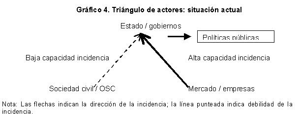 El gráfico 3 representa la situación actual en materia de incidencia sobre los estados y gobiernos: mientras las empresas privadas tienen una alta capacidad de incidencia, las OSC tienen una baja capacidad de incidir en las políticas públicas. Como resultante, las políticas públicas que son producto de las decisiones de los gobiernos tienden a no representar los intereses y puntos de vista de los distintos sectores de la sociedad.
