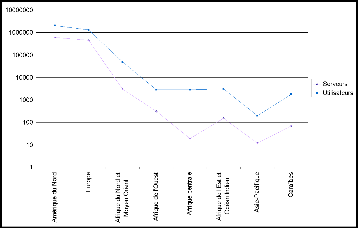 Parallèlement au développement des infrastructures de télécommunications, les autoroutes de linformation connaissent une croissance plus ou moins importante selon les régions. Notre évaluation, en date de juillet 1999, dénombre 1.056.467 serveurs et 3.363.259 utilisateurs répartis de la manière suivante : lAmérique du Nord, lEurope, lAfrique du Nord et le Moyen Orient, lAfrique de lOuest, lAfrique centrale, lAfrique de lEst et lOcéan Indien, lAsie-Pacifique et les Caraïbes.